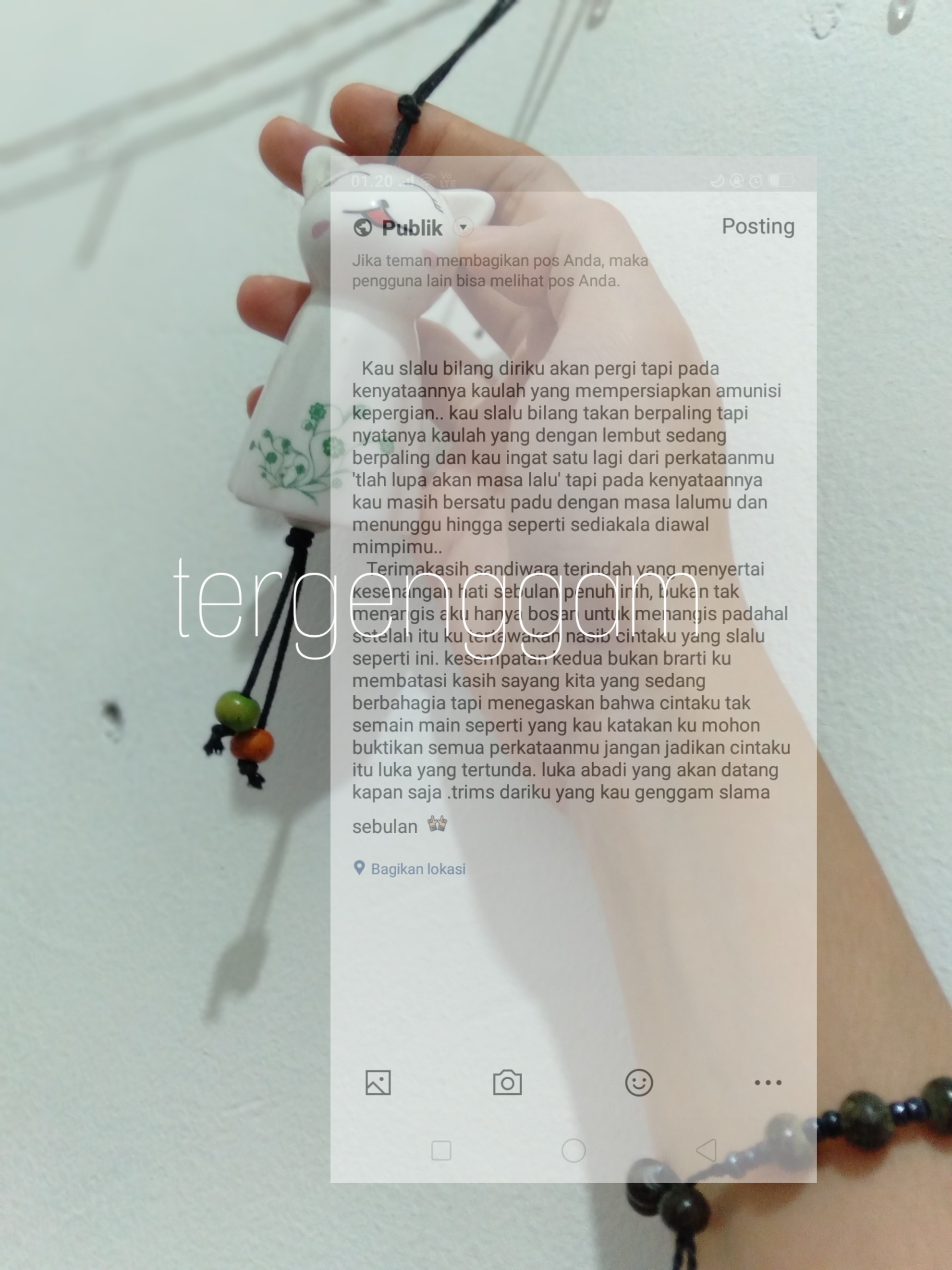 Lebih dari sekedar hebat, sangat mumpuni dalam hal setia. Begitu pernyataannya kepada setiap raga yang mudah mencintai. Dia manusai terindah dan terhebat yang perna aku temui. Cintanya tak terbatas, tetapi bisa melampaui batas bahkan sebagiannya lenyap bersama cahaya rindu yang palsu.. Dia serpihan fatamorganaku, datanglah seutuhnya walau entah kapan.