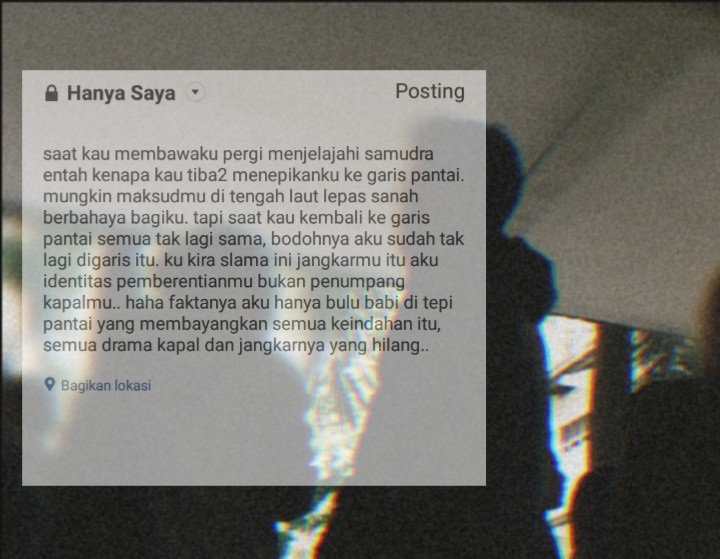 Hati ini hancur, dibiarkan dengan amatir sedangkan dia menunggu saya tenggelam dengan sendirinya. Riuh badai yang ia tidak inginkan, membuat saya berlyar dikebimbangan ini sendirian. Sepenuhnya saya telah tenggelam dan runtuh. Maaf mental berlayar saya payah bahkan kini telah usai, apakah dia senang(?)